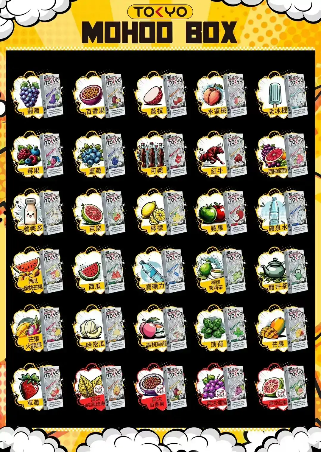 TOKYO MOHOO BOX 提供多達20多種口味選擇,特別針對不同使用者的需求,推出了涼版和無涼版的水果與煙草口味,讓每一位使用者都能找到最適合自己的風味。